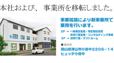 ●2023/7/18 事業所の移転に伴い、コンサルティング・居宅介護支援・訪問介護の業務を新事業所に移転します。 → 詳細はこちら 移転案内