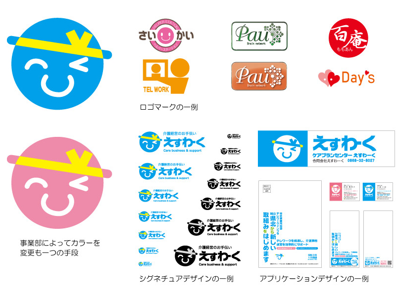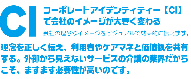 コーポレートアイデンティティーと言うと聴きなれない言葉ですが、わかりやすく説明すると、企業文化を構築や整理の上で、会社の特性や独自性を、統一されたイメージやデザインのもとに発信し、社会との共有をもって企業価値を高めていく戦略と言えます。一般的には会社のマークやロゴタイプなどを思い浮かべる方も多いのではないでしょうか。現物たる商品を販売する会社であればイメージがわきやすいですが、介護のような目に見えないサービスを提供する会社にとっては打ち出し方ひとつで対外イメージが大きく左右されます。難しく考えず、まず導入してみてはいかがでしょう。でも本当に大事なことは打ち出してから維持し、育てて行く方が本当の闘いだとも言えるでしょう。 |